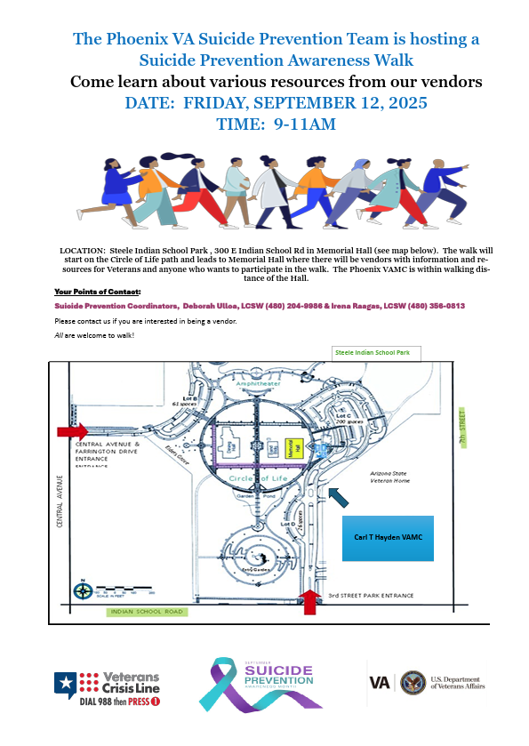 The Phoenix VA Suicide Prevention Team is hosting a Suicide Prevention Awareness Walk Come learn about various resources from our vendors.